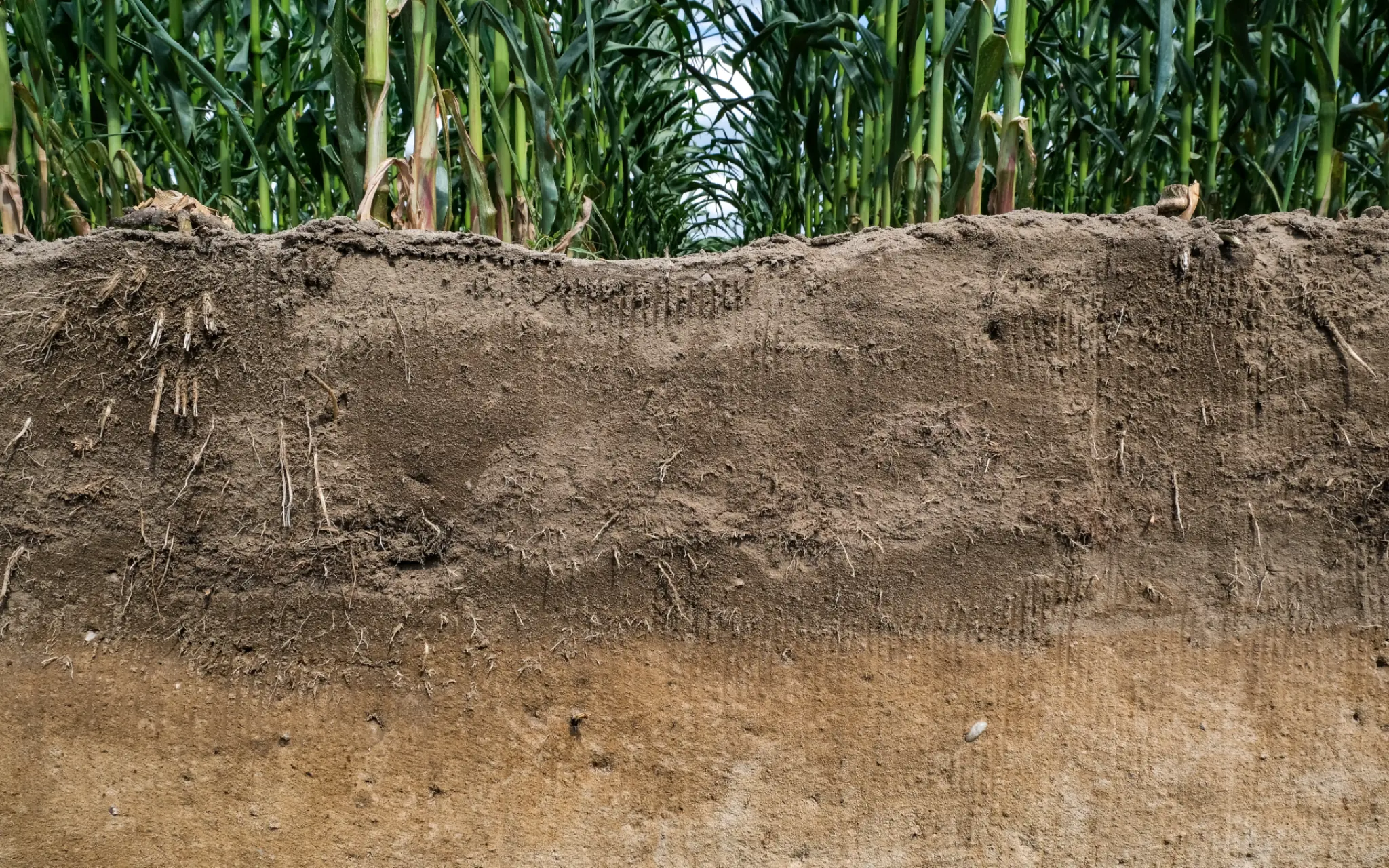 La terre arable (0–30 cm) se caractérise par une structure relativement homogène, une bonne richesse nutritive et des conditions généralement favorables à l’enracinement. C’est là que l’agriculteur agit en priorité, en veillant à la structure, à l’aération et à la gestion de l’eau afin d’offrir un cadre optimal à la croissance des cultures.